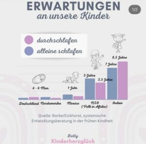 Gerade deshalb möchte ich hier nochmal betonen, dass Durchschlafen nichts über „gute Erziehung“ oder Reife aussagt. Viele Kinder entwickeln erst deutlich später, frühestens mit etwa 3 Jahren Schlafmuster, die uns Erwachsenen ähnlich sind. Das ist, wenn man es weltweit betrachtet, völlig normal und natürlich.